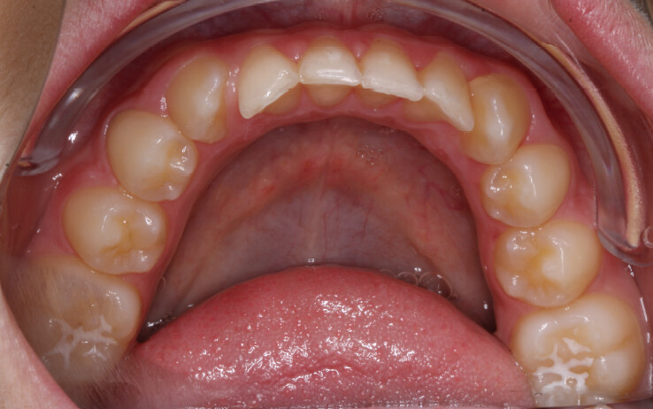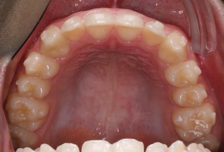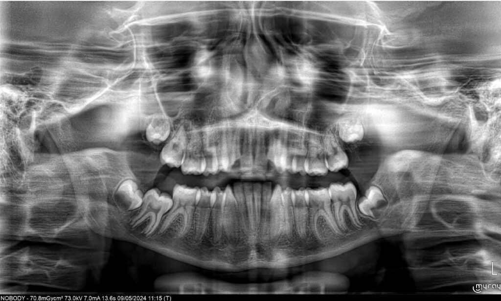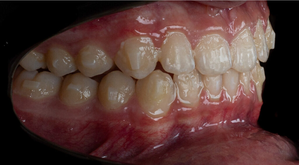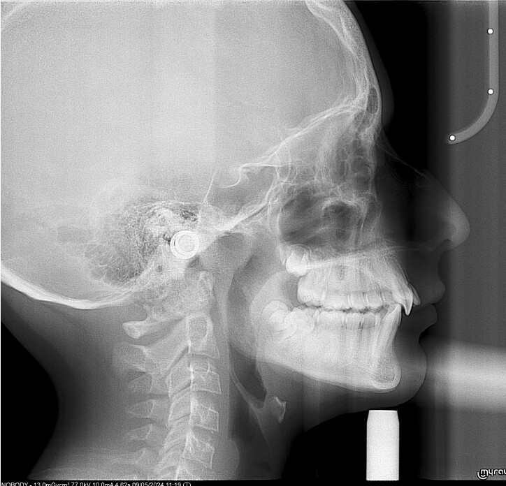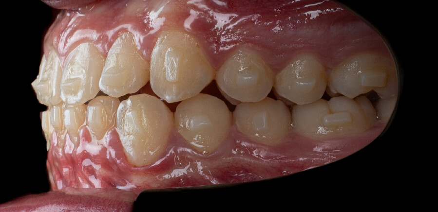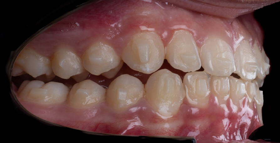 Um paciente do sexo masculino, com 13 anos de idade, apresentou-se com uma mordida profunda, caracterizada pela cobertura quase completa dos incisivos mandibulares. A avaliação clínica revelou apinhamento em ambas as arcadas, rotações dentárias e proclinação dos incisivos laterais superiores, contribuindo para as preocupações estéticas do paciente. O perfil facial era retrusivo, consistente com retrognatismo mandibular, e não foram detectadas anomalias periodontais significativas.