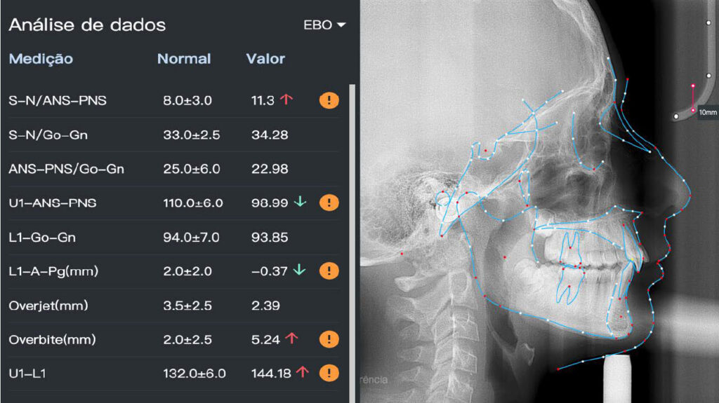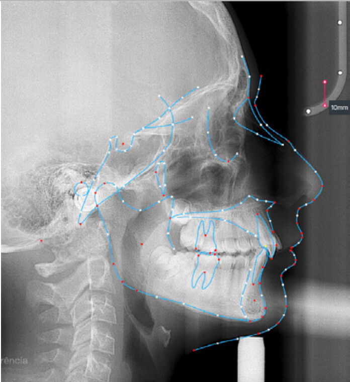 O paciente apresentava uma relação esquelética de Classe II com molares e caninos bilaterais em Classe II e um padrão dentário de Classe II divisão 2. A mordida profunda estava associada a um apinhamento anteroinferior e a uma curva de Spee acentuada. A análise facial revelou boa simetria, um terço facial inferior ligeiramente aumentado e um perfil convexo caracterizado por retrusão mandibular e do mento. A competência labial estava ligeiramente reduzida, com diminuição do ângulo nasolabial e leve tensão do músculo mentoniano, fatores que comprometiam a harmonia facial global.