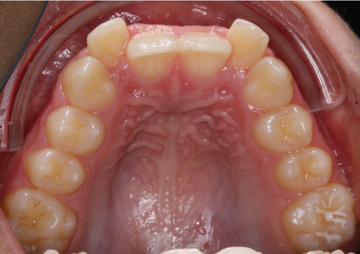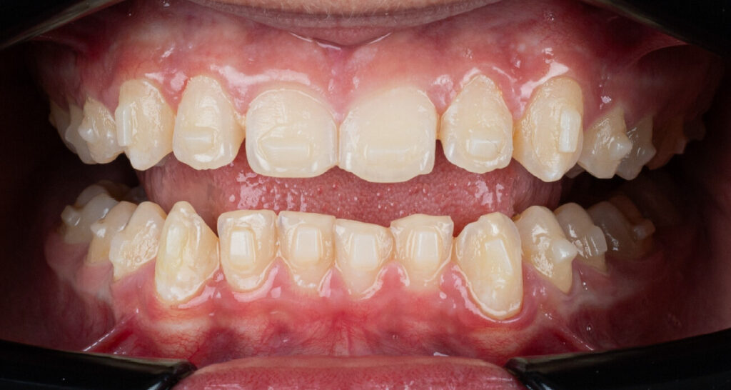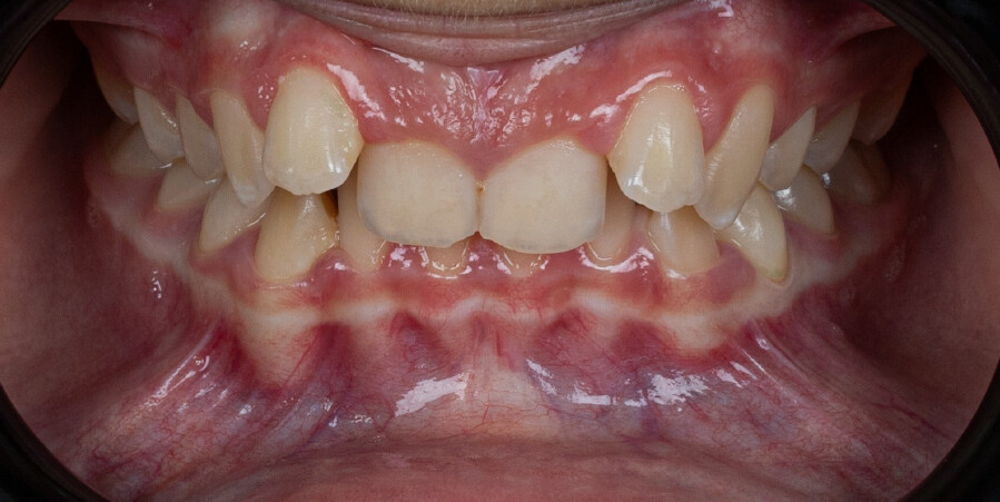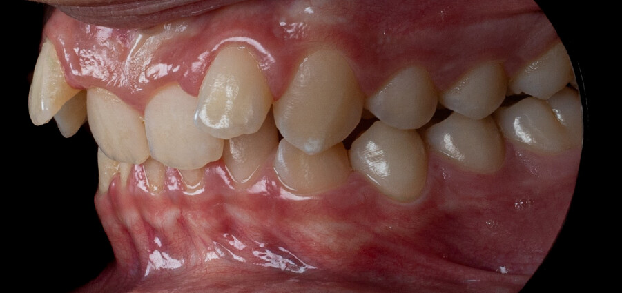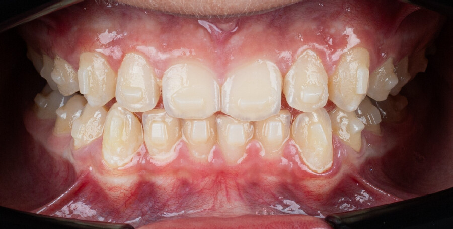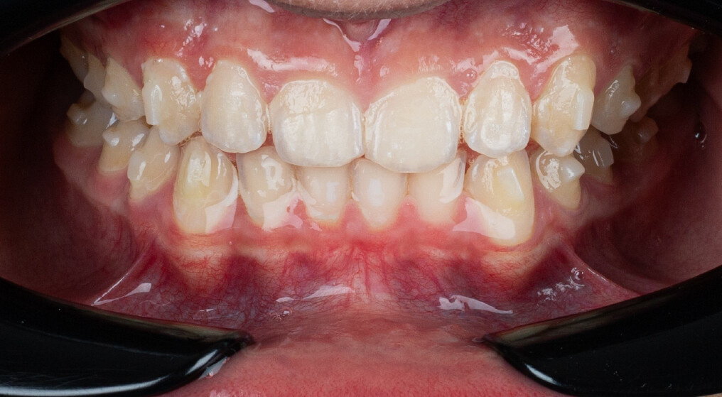 Queixa principal: As principais preocupações do paciente eram o sorriso gengival associado a uma mordida profunda e o espaço limitado disponível para o alinhamento anterior. O paciente também manifestou insatisfação com a posição dos incisivos laterais superiores, descrevendo-os como estando “demasiado altos.”